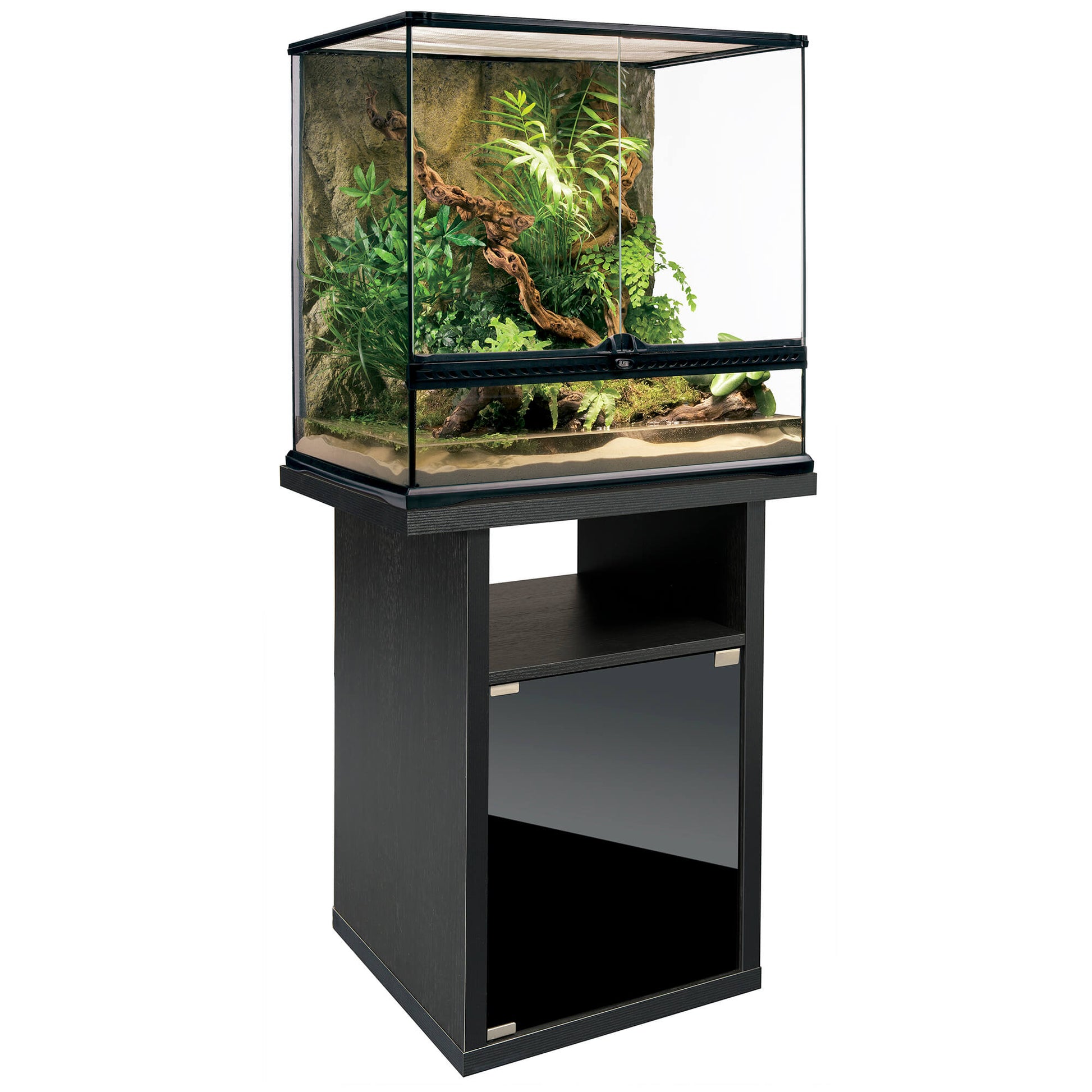 Diese eleganten Exo Terra Terrarienschränke passen perfekt zu den Exo Terra Terrarien. Mit der modernen schwarzen Lackierung und den Glastüren setzen diese Schränke Ihr Terrarium gut in Szene. Dank der magnetischen Verschlüsse und glatten Metallscharniere lassen sich die Tür(en) leicht öffnen. Ausserdem verleihen sie dem Terrarienschrank ein modernes Designer-Aussehen. In dem integrierten Lagerfach kann unansehnliches Lebendfutter oder anderes Zubehör aufbewahrt werden. Das äussere Regal bietet jedoch einen hübschen Platz für Bücher und andere Dinge. Die Exo Terra Terrarienschränke sind flach verpackt und einfach zusammenzubauen. Diese stabilen und widerstandsfähigen Exo Terra Terrarienschränke wurden in Grossbritannien konstruiert und bestehen aus Material nachhaltiger Forstwirtschaft. Du bist daher nicht nur umweltfreundlich, sondern bildest auch eine atemberaubende Kulisse für deine Reptilien.