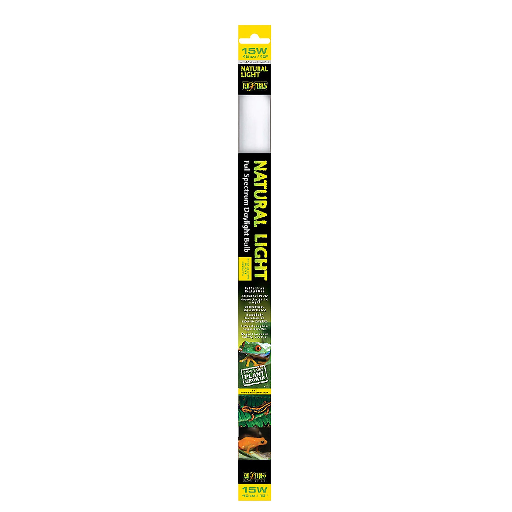 Die Exo Terra Natural Light ist eine Vollspektrum-Tageslichtlampe, die als allgemeine Lichtquelle für alle Terrarienarten geeignet ist. Dank der von der Exo Terra Natural Light ausgestossenen Wellenlängen können die Reptilien die Farben ihrer Umgebung natürlicher erleben und wahrnehmen. Die Exo Terra Natural Light trägt dazu bei, die Lebensbedingungen und das physiologische Wohlbefinden der Reptilien zu verbessern. Mit den speziellen Wellenlängen ist die Lampe für bepflanzte Terrarien geeignet und ist ideal für Tiere mit geringeren UV-Bedürfnissen, wie beispielsweise Schlangen, Amphibien (Frösche, Kröten und Salamander) und nachtaktive Tiere. S (15W/45cm) M (18W/60cm) L (25W/75cm) XL (30W/90cm)