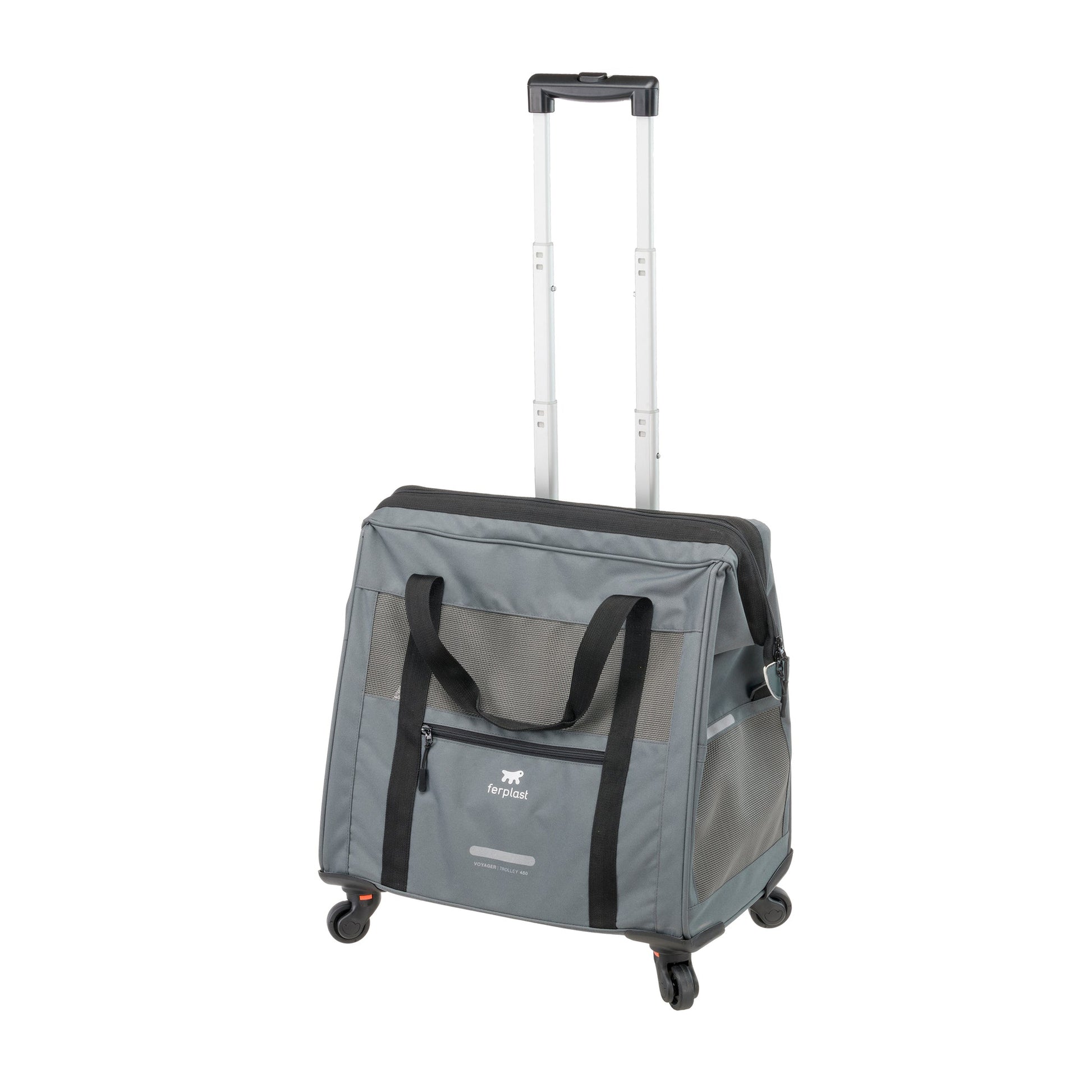 Der Trolley für den Transport von Katzen und Hunden vereint Praktikabilität und Vielseitigkeit und ist die ideale Lösung für jede Reise. Er wurde entwickelt, um sowohl dir als auch deinem Haustier höchsten Komfort und Sicherheit zu bieten. Gefertigt aus widerstandsfähigem 600-Denier-Polyester mit PU-Beschichtung, ist er kratzfest, langlebig und wasserabweisend. Der ausziehbare, verstellbare Teleskopgriff sorgt für eine mühelose Handhabung, während die 360° drehbaren und abnehmbaren Rollen den Transport in jeder Situation erleichtern. Das klappbare Sicherheitsnetz auf der Oberseite ermöglicht einen einfachen Zugang und schafft eine gut belüftete Umgebung. Grosse seitliche Netzfenster fördern die Luftzirkulation und sorgen für maximalen Komfort. Innen bietet eine geräumige Tasche Platz für wichtige Utensilien, ergänzt durch eine grosse Aussentasche für Snacks, Dokumente oder Zubehör. Der integrierte Sicherheitsgurt erlaubt die sichere Befestigung von Halsband oder Geschirr. Dank verstellbarer Schultergurte und eines oberen Griffs kann der Trolley auch als Tragetasche genutzt werden. Ein hinterer Gurt ermöglicht die Befestigung an einem Koffer, perfekt für Flug- oder Bahnreisen. Reflektierende Elemente verbessern die Sichtbarkeit bei schlechten Lichtverhältnissen, während das personalisierbare Namensschild eine individuelle Kennzeichnung ermöglicht. Das italienische Design kombiniert Robustheit mit höchstem Komfort. Der Trolley ist in verschiedenen Farben erhältlich und hat eine maximale Tragfähigkeit von 15 kg.