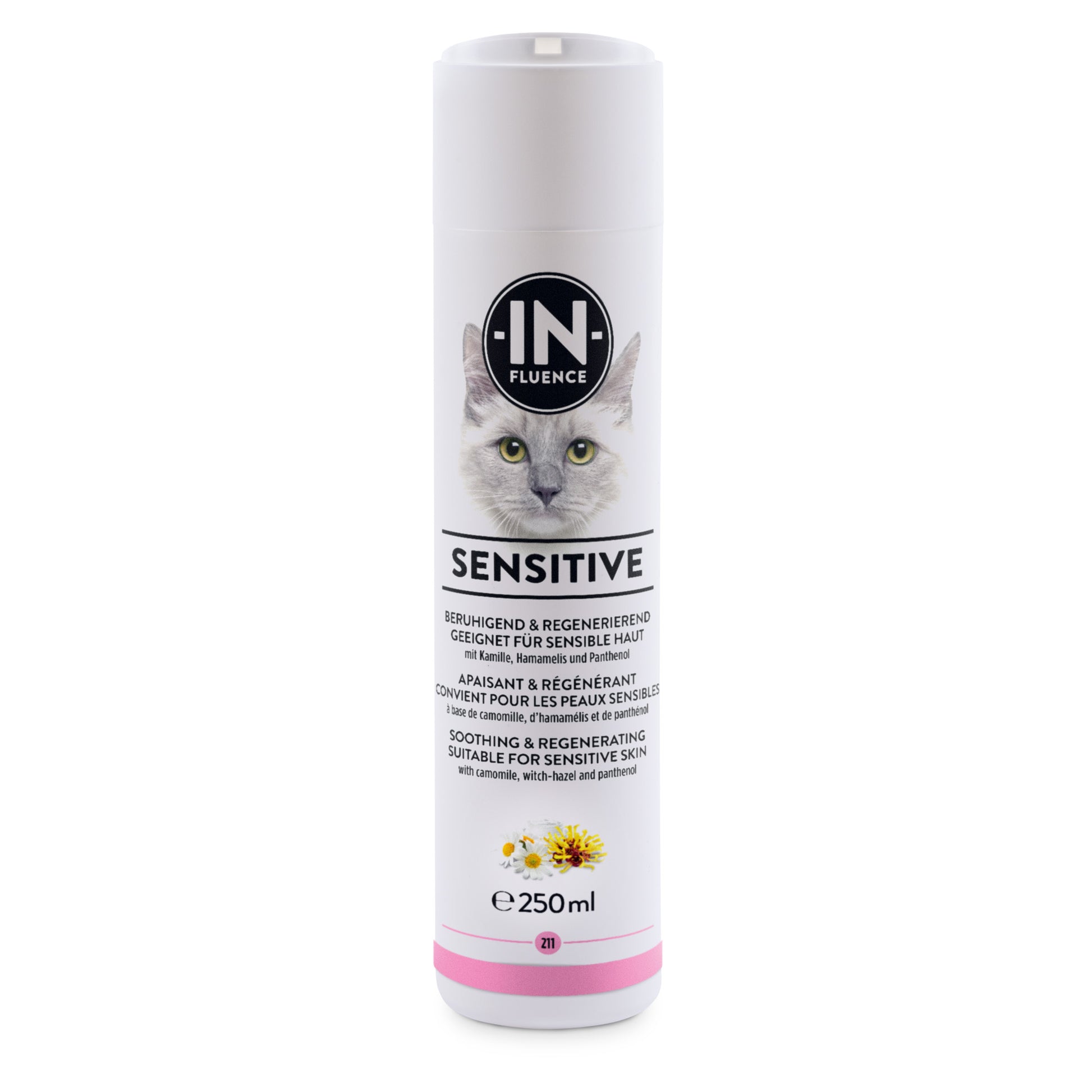 Das beruhigende Shampoo Sensitive ist bestens geeignet für Katzen mit sensibler Haut und anspruchsvollem Fell. Die milde Rezeptur mit beruhigender Kamille, regenerierendem Hamamelis, pflegendem Panthenol und Vitamin E reinigt sanft das Fell und ist gleichzeitig schonend zur Haut. Das Shampoo ist optimal auf den pH-Wert der Katzenhaut abgestimmt und kann regelmässig angewendet werden. Ohne Mineralöle, Silikone und Parabene.,< 5 % anionische Tenside, < 5 % amphotere Tenside, Duftstoffe, Phenoxyethanol.