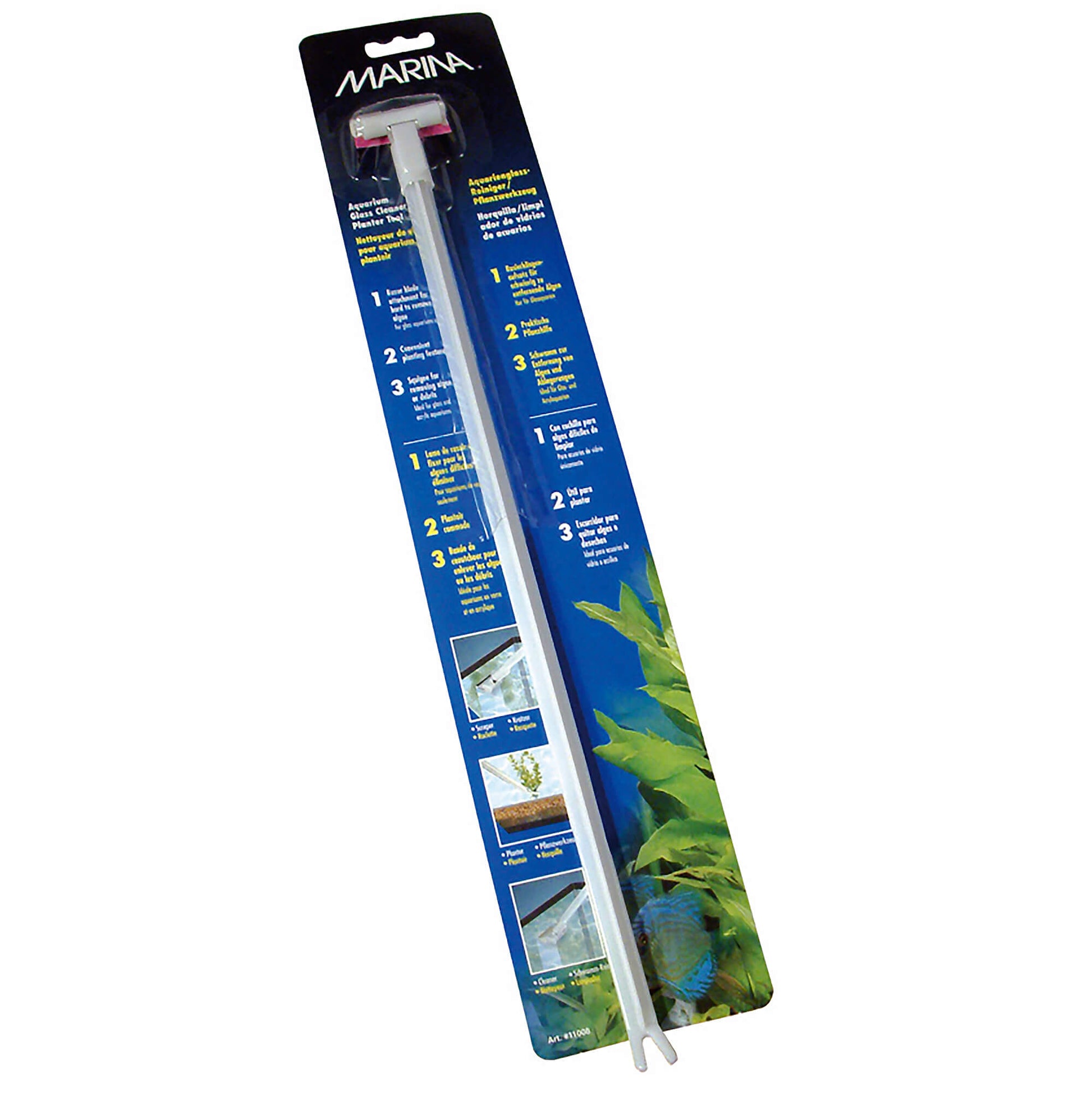 Der Marina 4-fach Scheibenreiniger eignet sich perfekt für Glasaquarien. Dank der 4-fach Technologie ist nur ein Werkzeug für unterschiedliche Bereiche notwendig, was die Reinigung vereinfacht. Die Rasierklinge hilft dir schwer zu entfernende Algen zu vernichten, weiter können mit dem Schwamm Ablagerungen entfernt werden, um so wieder eine glasklare Sicht zu haben. Das Einpflanzen von Aquarienpflanzen ist möglich, wie auch das Entfernen von nicht mehr benötigten Pflanzenteilen. Der verstellbare Daumengriff rundet das Werkzeug perfekt ab.
