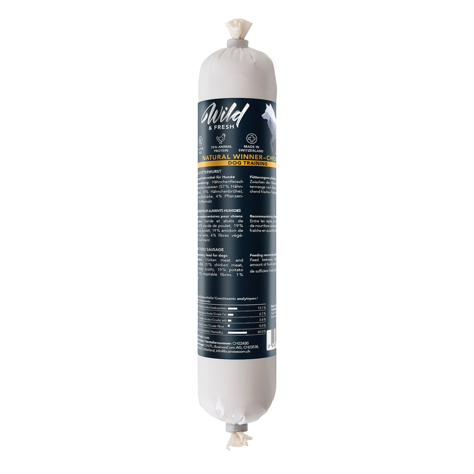 Die Wild & Fresh Trainingswurst mit Huhn und Reis werden in der Schweiz hergestellt und sind glutenfrei. Die Wurst verfügt über einen hohen Fleischanteil und kann als Snack oder Belohnung beim Training verfüttert werden. Die Ragout Wurst ist nicht nur ein Gaumenschmaus für deinen liebsten Vierbeiner, sondern durch die Verpackung auch ein echter Hingucker.,Hähnchenfleisch und Hähncheninnereien (57 % Hähnchenfleisch, 19 % Hähnchenbrühe), 19% Kartoffelstärke, 4% Pflanzenfasern, 1% Meersalz